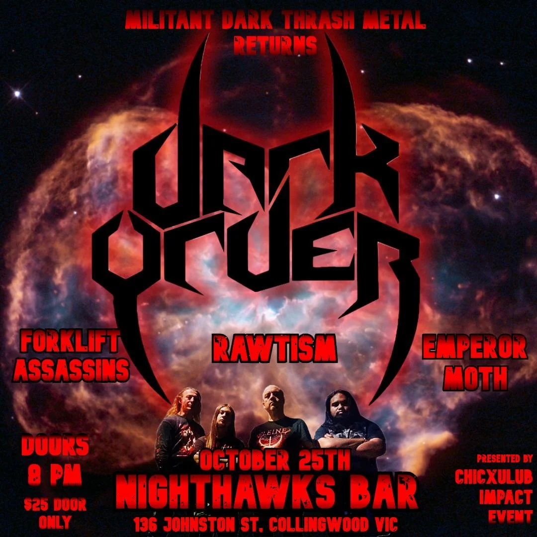 DARK ORDER returns to the Melbourne to bring their dark militant Thrash Metal to rain down the truth of humanity. DARK ORDER has been in the Australian metal scene since 1993 continuously, with 3 albums released and currently recording their 4th album. Come witness the most unique and longest lasting Thrash Metal band to come from Terra Australis... Supported by Forklift Assassins, Rawtism & Emperor Moth 8:15 PM Doors SATURDAY 25th OCTOBER $25 on the door ONLY