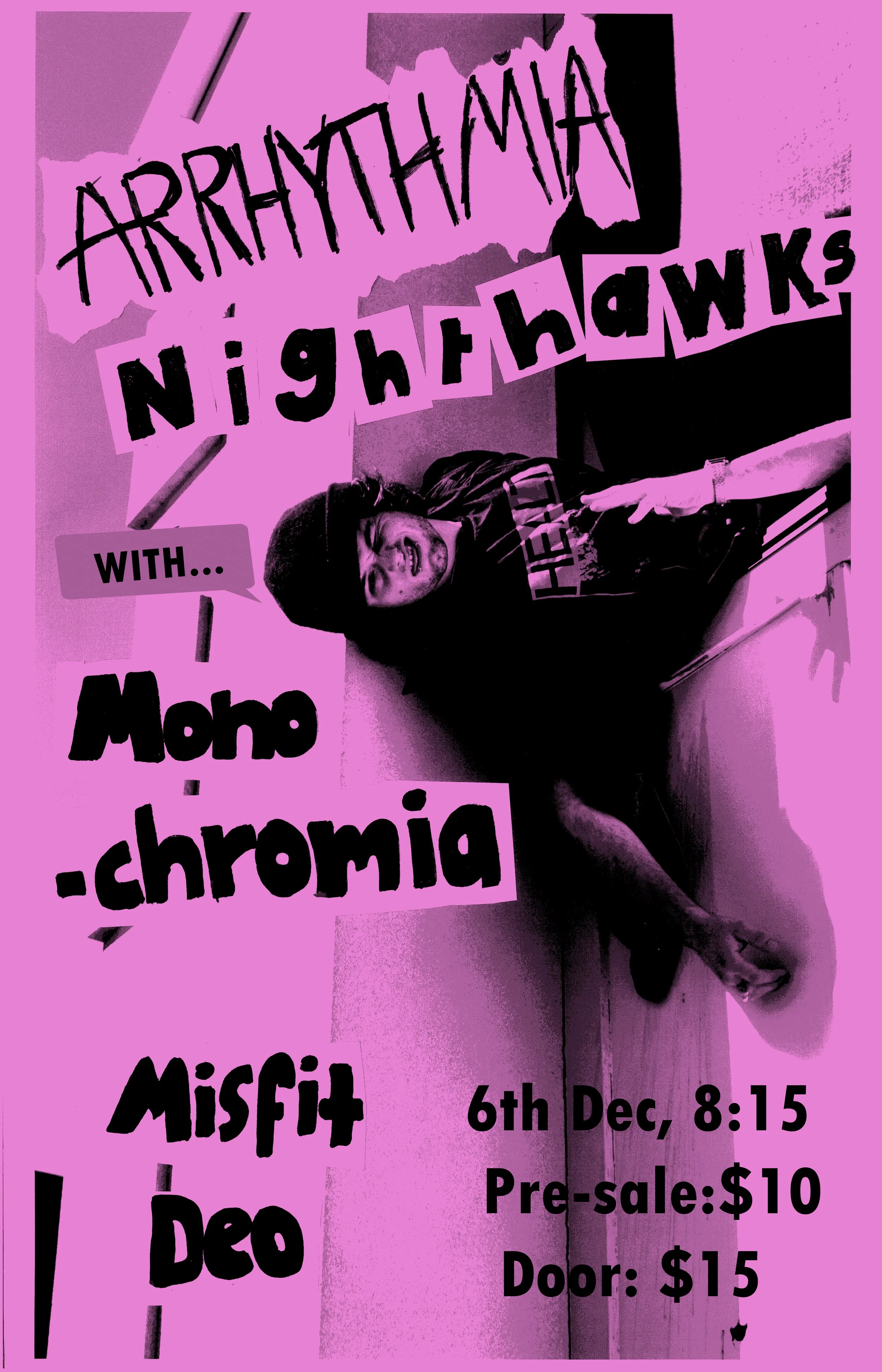 Venture down to Nighthawks to witness the M.M.A hardcore/grunge show on the 6th of December. Featuring MisfitDeo, Monochromia and Arrhythmia!