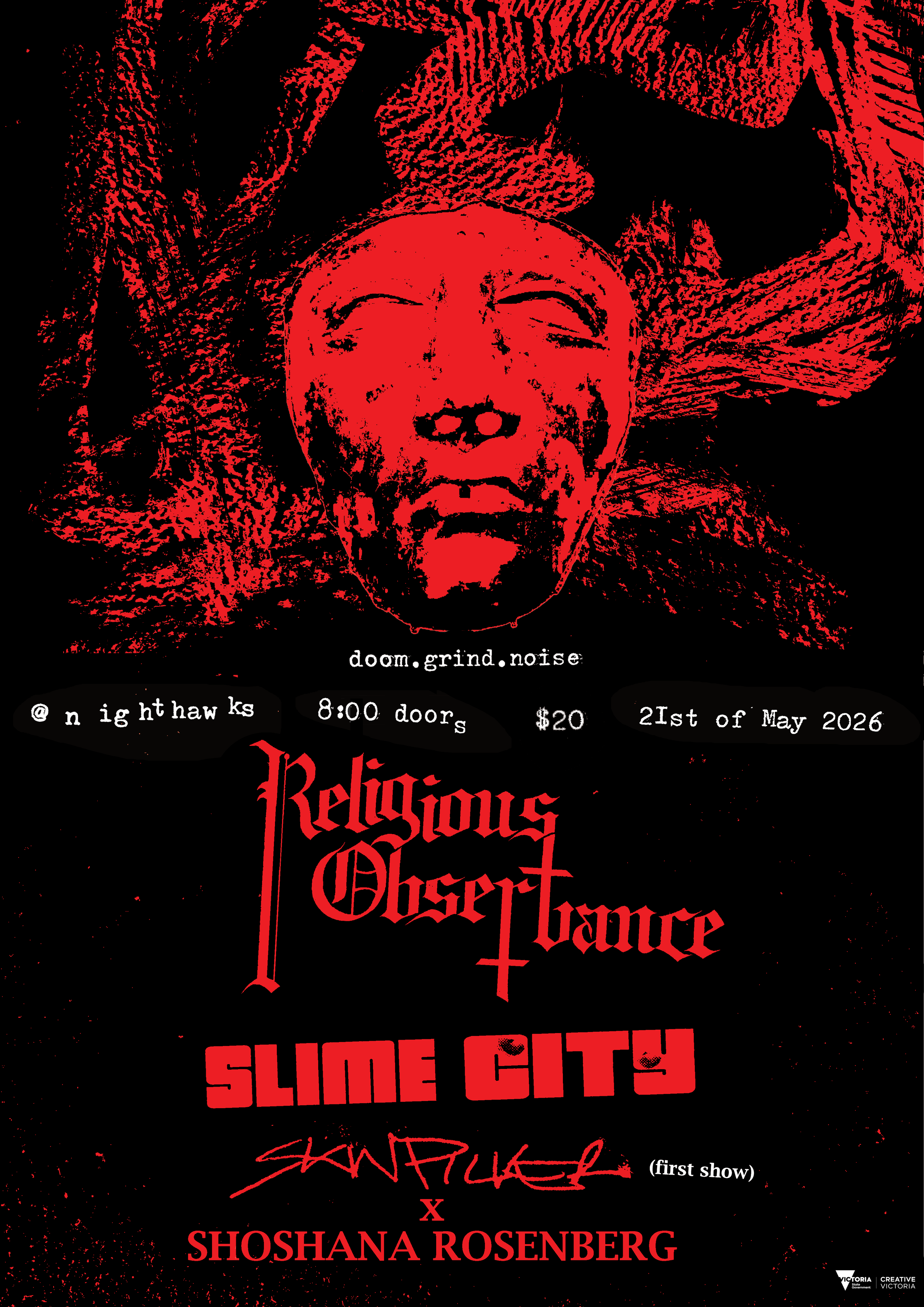 21st of May at Nighthawks. a crushing obliteration of extreme metal genres. Doom masters Religious Observance, filth and dirge grind of Slime City and the debut of Skinpicker collaborating with Shoshana Rosenberg.